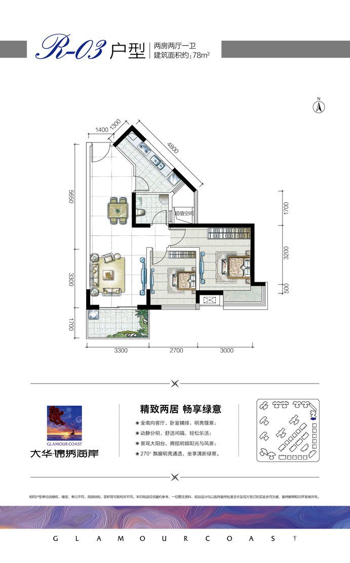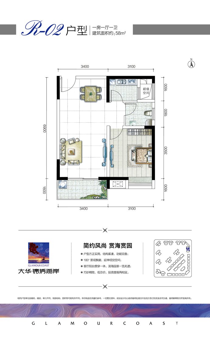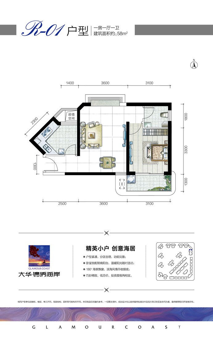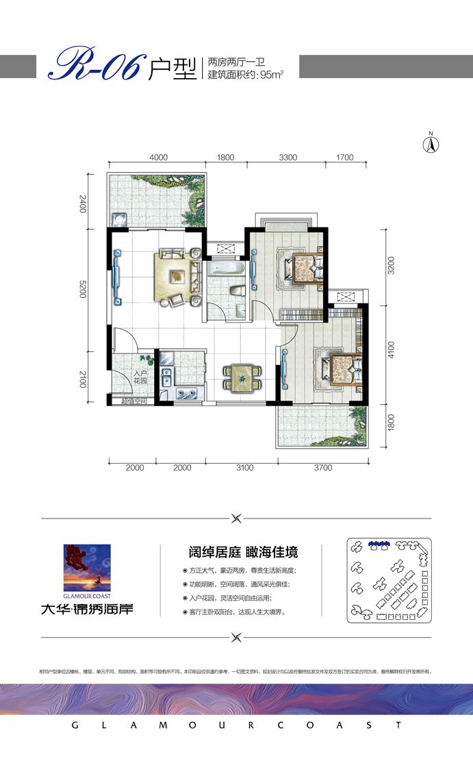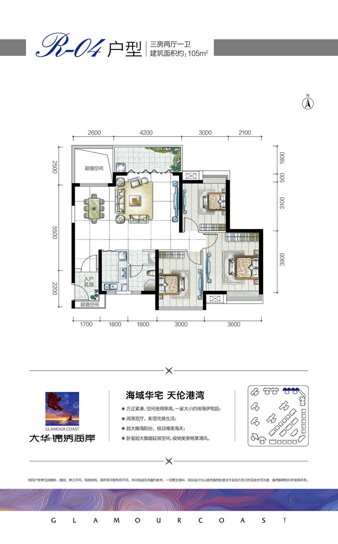 大华锦绣海岸项目一期总占地面积为56336㎡;总建筑面积约117513㎡,容积率为1.75,绿化率为40%,共1044户,987个车位。