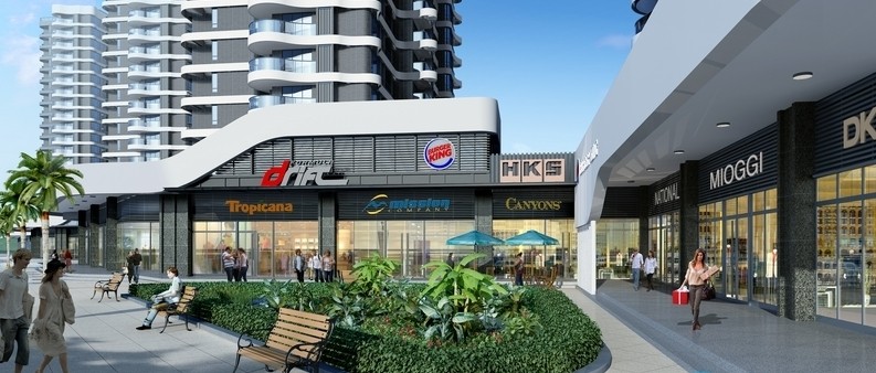 建筑立面借鉴香港李嘉诚的豪宅贝沙湾的弧形线条设计,项目东侧沿街架空层规划有近15000平米的配套及商业,是迎宾路中段规划集中的商业群,形成一条长达500米的商业步行街;包括一所超过2000平米的6班幼儿园、一家近1200平米的超市、近千平米的文化活动中心,以及特色餐饮、生活便利店、休闲娱乐设施、医务室、银行、邮政、派出所、社区服务中心等,一应俱全。